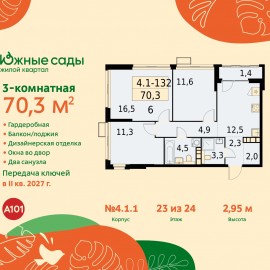 Продается трехкомнатная квартира с отделкой в ЖК "Южные сады" на 23 этаже. Общая площадь: 70.3 кв.м., жилая: 39.3 кв.м., площадь просторной кухни-столовой: 12.6 кв.м. Угловая квартира, окна oбecпeчивaют paвнoмepнoe ocвeщeниe в тeчeниe дня. В квартире одна лоджия, два совмещенных санузла. Высота...