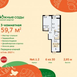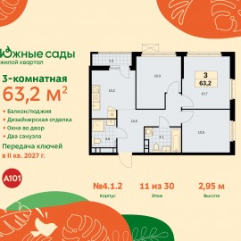 3-комн. квартира с отделкой в ЖК "Южные сады" на 11 этаже. Общая площадь: 63.2 кв.м. Высота потолков 2.95 м. Дом монолитный, черырехподъездный, переменной этажности, от 11 до 30 этажей. Квартира находится в 1-й секции высотой 11 этажей в корпусе 4.1.2. На этаже 6 квартир. В подъезде 1...