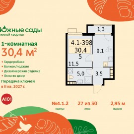 Продается 1-комн. квартира от застройщика с отделкой в ЖК "Южные сады" на 27 этаже. Общая площадь: 30.4 кв.м., жилая: 11.5 кв.м., площадь просторной кухни-столовой: 9.1 кв.м. Все окна выходят на одну сторону. В квартире один балкон, один совмещенный санузел. Высота потолков 2.95 м. Имеется...
