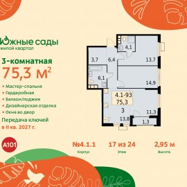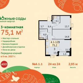 3-комн. квартира с европланировкой и отделкой в ЖК "Южные сады" на 24 этаже. Общая площадь: 75.1 кв.м., жилая: 39.9 кв.м., общая площадь гостиной-столовой с кухонной зоной: 25.1 кв.м. Европланировка, зона гостиной комнаты объединена с кухней. Угловая квартира, окна oбecпeчивaют paвнoмepнoe...