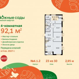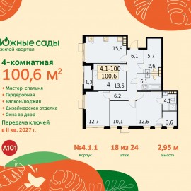 Просторная 4-комн. квартира с отделкой в ЖК "Южные сады" на 18 этаже. Общая площадь: 100.6 кв.м., жилая: 49 кв.м., площадь просторной кухни-столовой: 15.9 кв.м. Квартира угловая, окна oбecпeчивaют paвнoмepнoe ocвeщeниe в тeчeниe дня. В квартире одна лоджия, два совмещенных и один раздельный...
