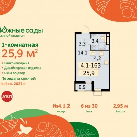 Продается однокомнатная квартира-студия от застройщика с отделкой в ЖК "Южные сады" на 6 этаже. Общая площадь: 25.9 кв.м., площадь гостиной 18.3 кв.м., из которых 4.2 кв.м. выделено под кухонную зону. Все окна выходят на одну сторону. В квартире одна лоджия, один совмещенный санузел....