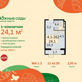 Просторная 1-комн. квартира-студия с отделкой в ЖК "Южные сады" на 11 этаже. Общая площадь: 24.1 кв.м., площадь гостиной 14.8 кв.м., из которых 4.5 кв.м. выделено под кухонную зону. Все окна выходят на одну сторону. В квартире один балкон, один совмещенный санузел. Высота потолков 2.95 м....