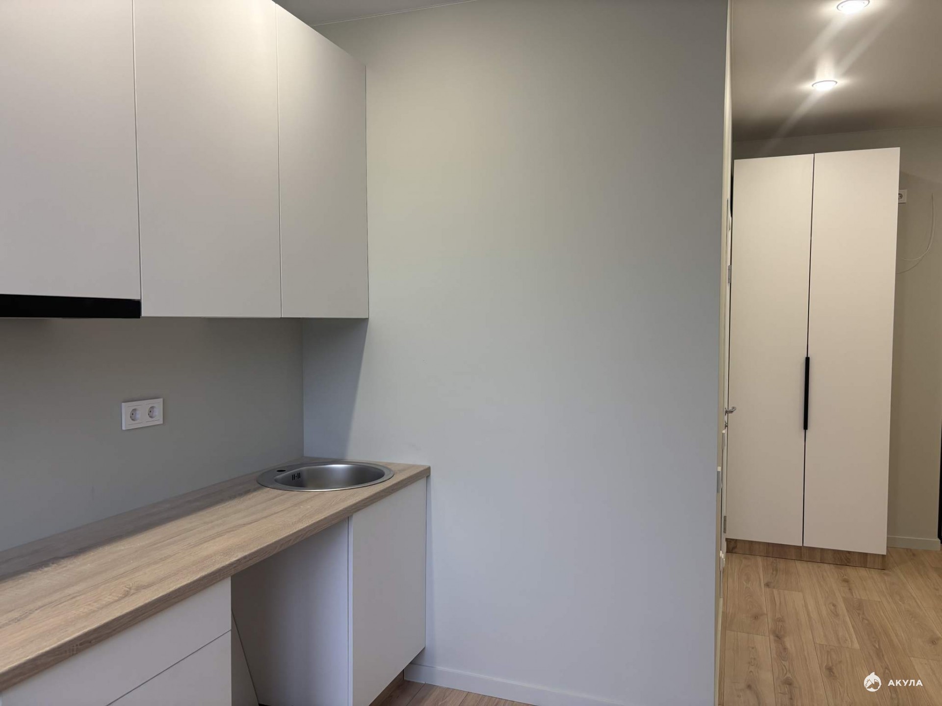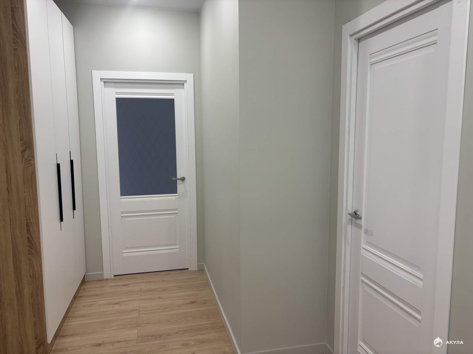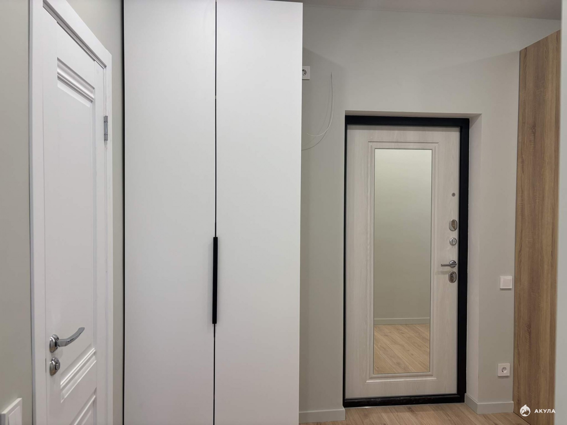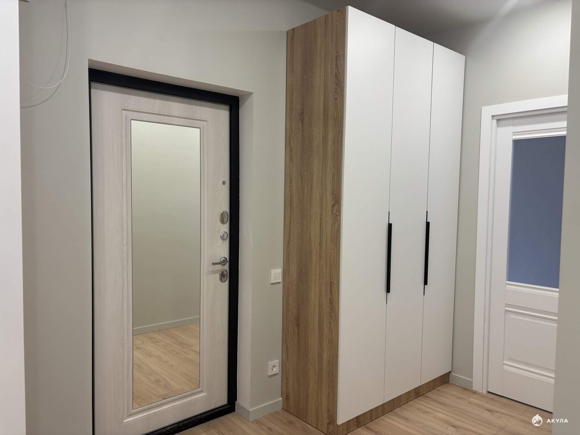 Входная дверь с зеркалом, ламинат 32 класса, натяжные потолки, обои в сдержанных тонах, межкомнатные двери, розетки, выключатели, точечные светильники, установлен кондиционер;
