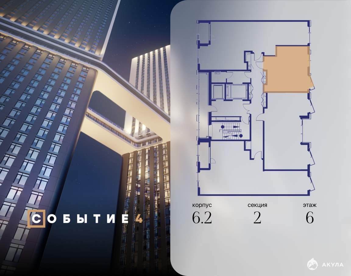 Продаётся квартира-студия от застройщика: общая площадь 34.50 м, жилая 20.00 м, кухня 5.60 м, 6-й этаж, жилой квартал «Событие-6», корпус 2 (секция 2) Срок сдачи: 1 квартал 2029 года.
