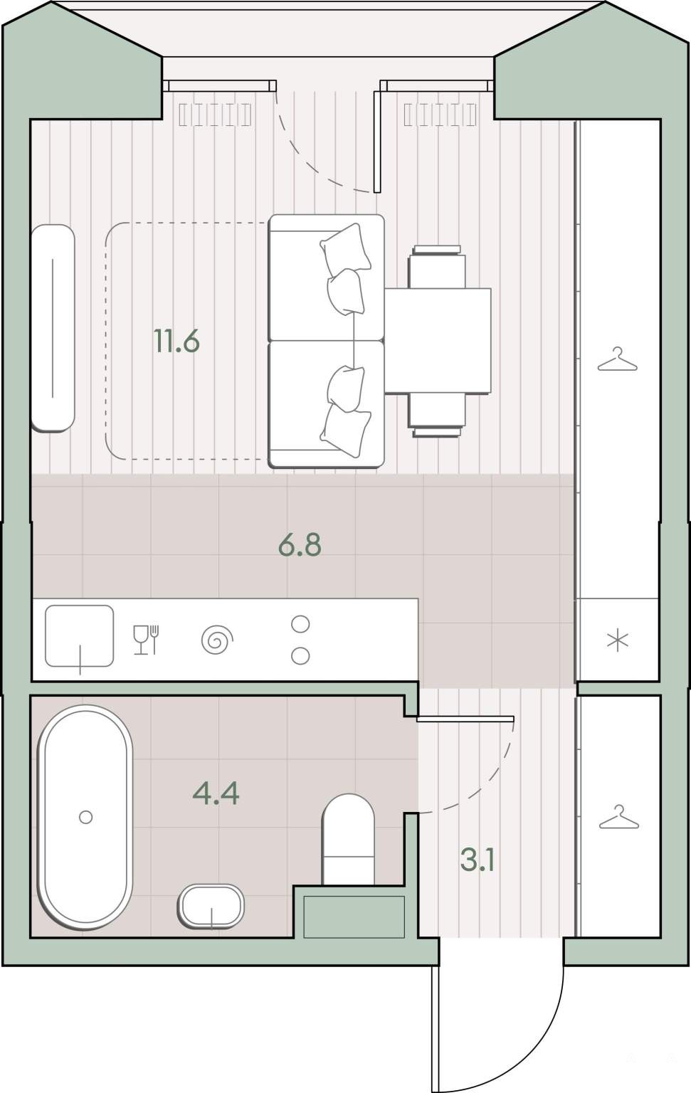 Жилая площадь 11.6 м2, кухня 6.8 м2, квартира без отделки, комнаты изолированные.