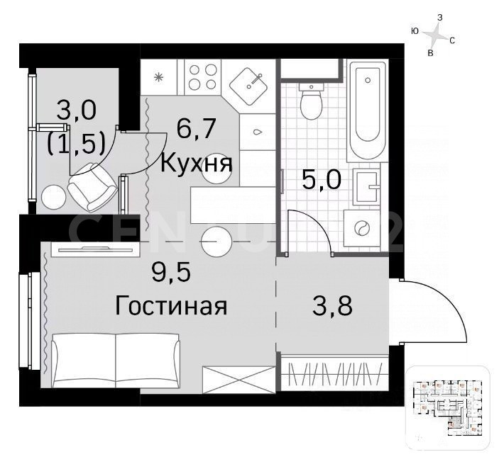 - 9.5 м²