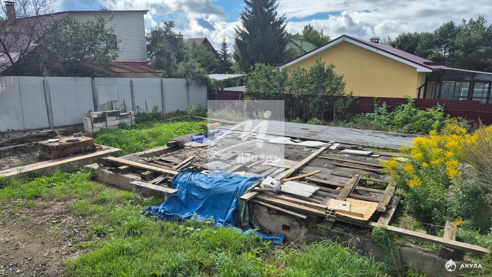 Участок правильной прямоугольной формы. Огорожен по периметру металлическим забором с воротами. На участке имеется фундамент 9*9 м с цоколем. Колодец. Бетонный гараж. Электричество 15 кВт. Газ по границе СНТ. Много плодовых деревьев, несколько туй.
