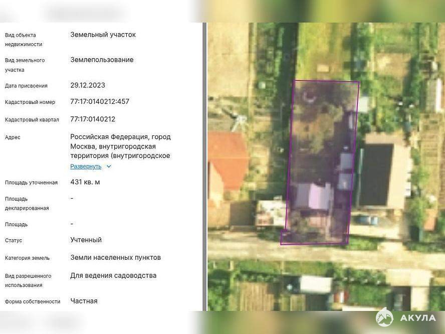 Земельный участокобщая площадь 431 +/- 7 кв. мкадастровый номер 77: 17: 0140212: 457категория земель: земли населенных пунктов виды разрешенного использования: для ведения садоводстваМестонахождение: Российская Федерация, город Москва, внутригородская территория (внутригородское муниципальное образование) города федерального значения поселение Десеновское, квартал 148, земельный участок 56Координаты: 55.47775175, 37.3900283