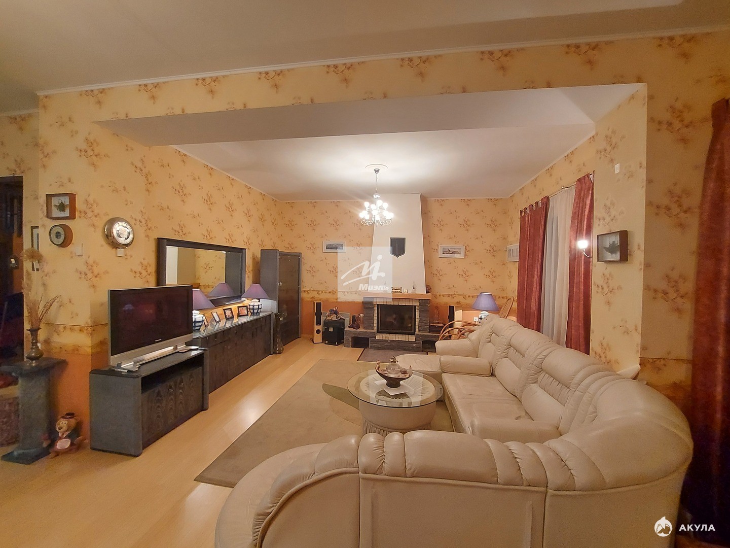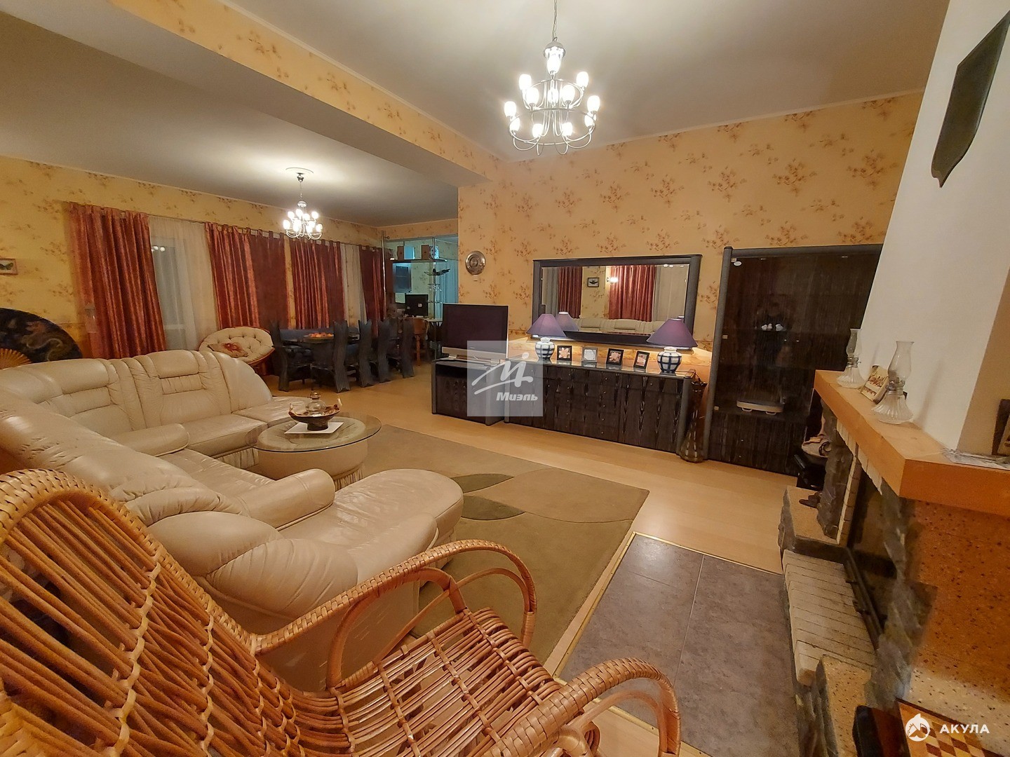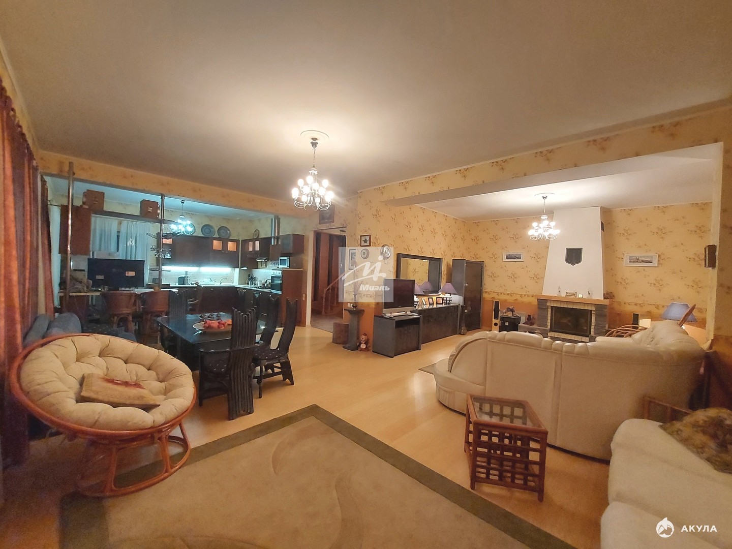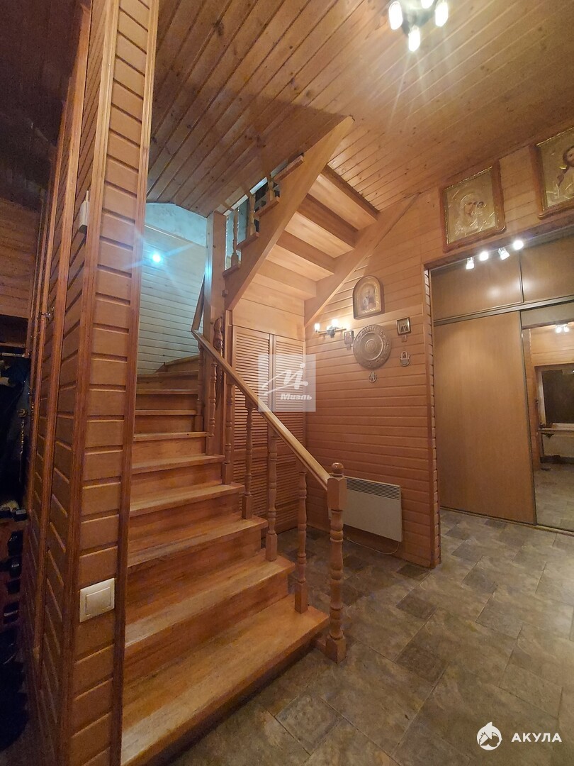 В доме расположены: на 1-ом этаже просторная светлая гостиная с камином, кухня-столовая, оснащенная современной бытовой техникой, кабинет, детская комната, вместительная гардеробная и в широкой прихожей коридора большой зеркальный шкаф-купе с антресолями, полноценный 1 сан. узел; на 2-ом этаже четыре спальные комнаты, 3 полноценные сан. узла, просторный холл - диванной зоны отдыха поделен на две части, одна из которых отмечена камином; на 3-м этаже пространство делится на две полноценные комнаты со спальным местом.