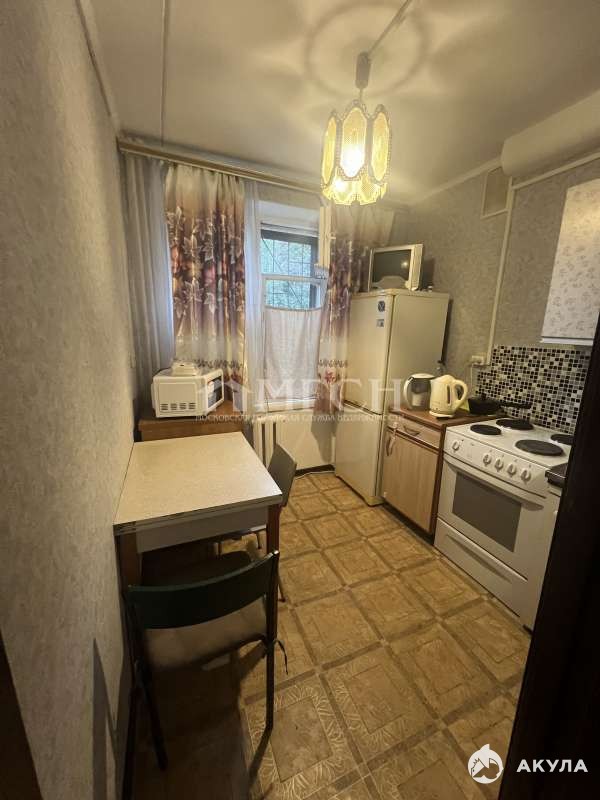 Стенка, двуспальная кровать, телевизор. Кухонный гарнитур с бытовой техникой.