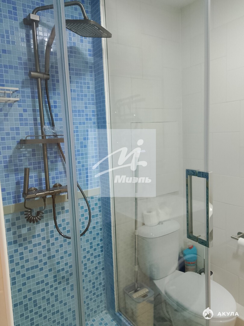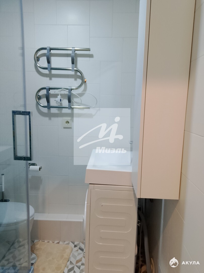 Санузел совмещенный, имеет душевую кабину, стиральную машину.