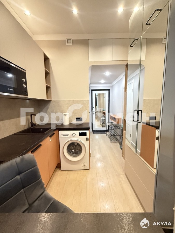 Общая площадь квартиры 13.3 м2. ПРОДУМАННОЕ зонированное пространство: открытая зона кухни с кухонной мебелью и встроенной техникой, зона спальни, кабинет, коридор и санузел.