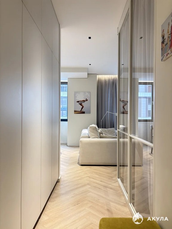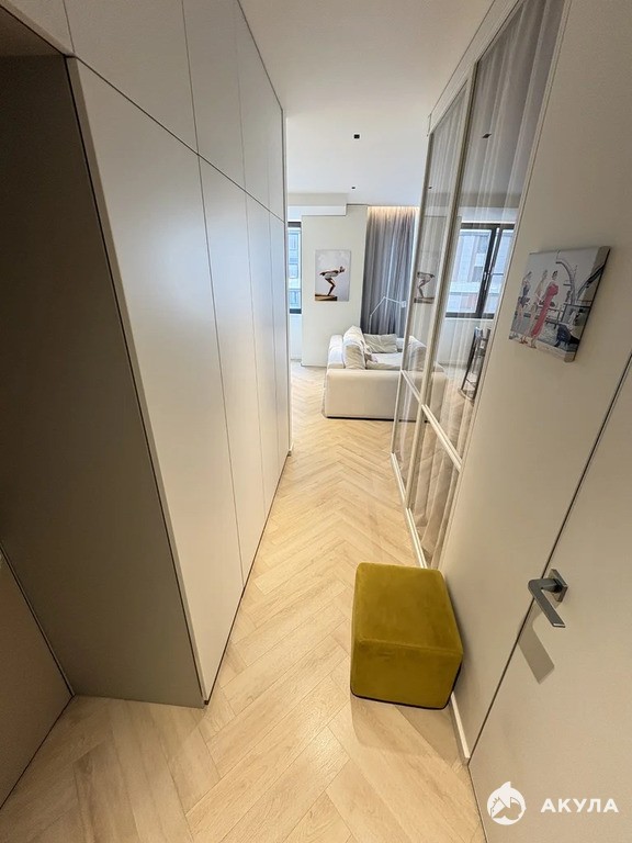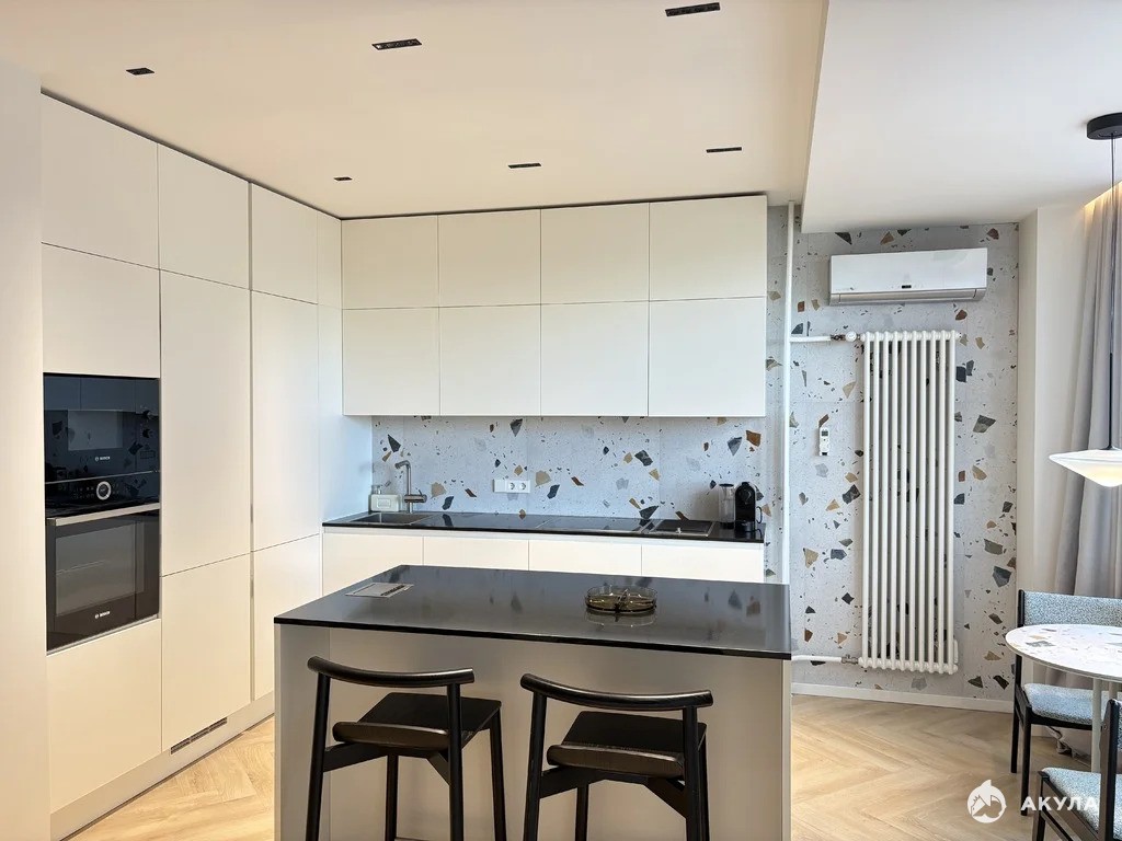 Современный ремонт в светлых тонах, по проекту известного архитектора. Ремонт изначально делали не на продажу и не для аренды, а для себя. О квартире написана статья в известном издательстве, как об одной из самой стильной и функциональной, комфортной квартире. В квартире кухня-гостиная и отдельно за стеклянными витражными перегородками спальня, но фото хорошо видно. Множество мест хранения. Санузел с ванной. Гардеробная. Кондиционер. В санузле также есть вместительный шкаф. Сантехника: Jacob delafon, ideal Standart. На кухне : смеситель Grohe, мойка OMOIKIRI. Микроволновка, духовка Bosch. Варочная панель, посудомойка Electrolux. Гриль SMEG. Холодильник LIEBHER. Мебель Mr doors, кухня Scavolini. Столешница кварц. Светильники итальянские светодиодные FLOS, Vibia. Потолки гипсокартон с шумоизоляцией. Красивый вид из окна.