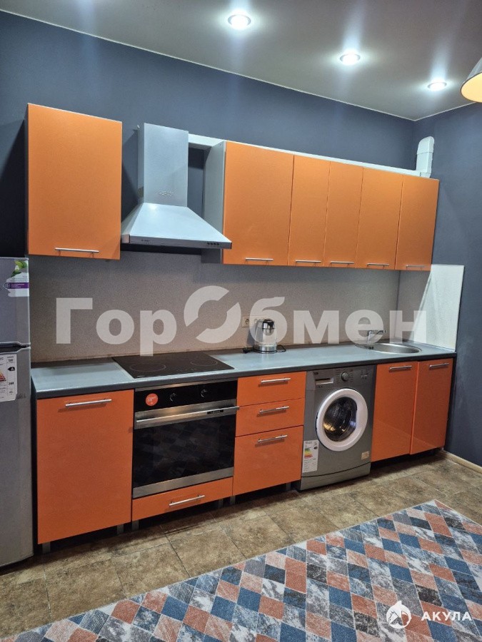 Кухня большой площади, с выходом на лоджию (с панорамными окнами) станет идеальным местом для кулинарных экспериментов и семейных встреч. Кухня оснащена красивым современным кухонным гарнитуром красивого оранжевого цвета, а также необходимой техникой: варочной панелью, духовым шкафом, вытяжкой, стиральной машинкой.