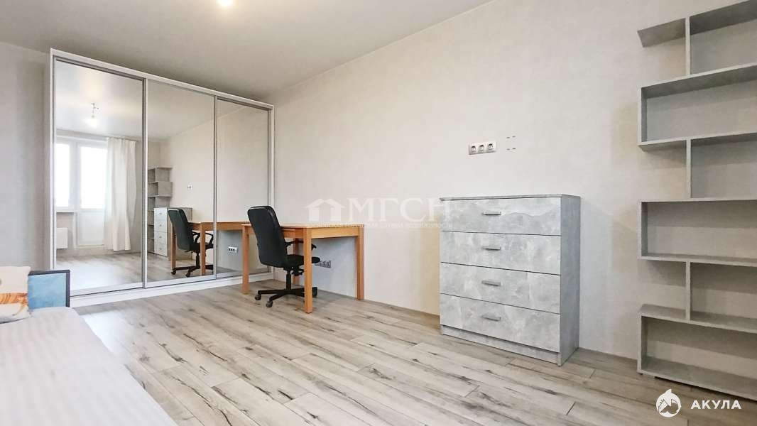 - В комнате установлен вместительный шкаф-купе, стоит раскладной диван, письменный стол с офисным стулом, комод, журнальный столик, тумба и полки для хранения книг и других личных вещей;