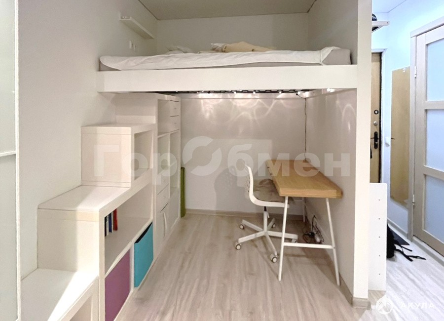 В комнате большой шкаф и стол для работы или учебы, спальное место на антресоли.