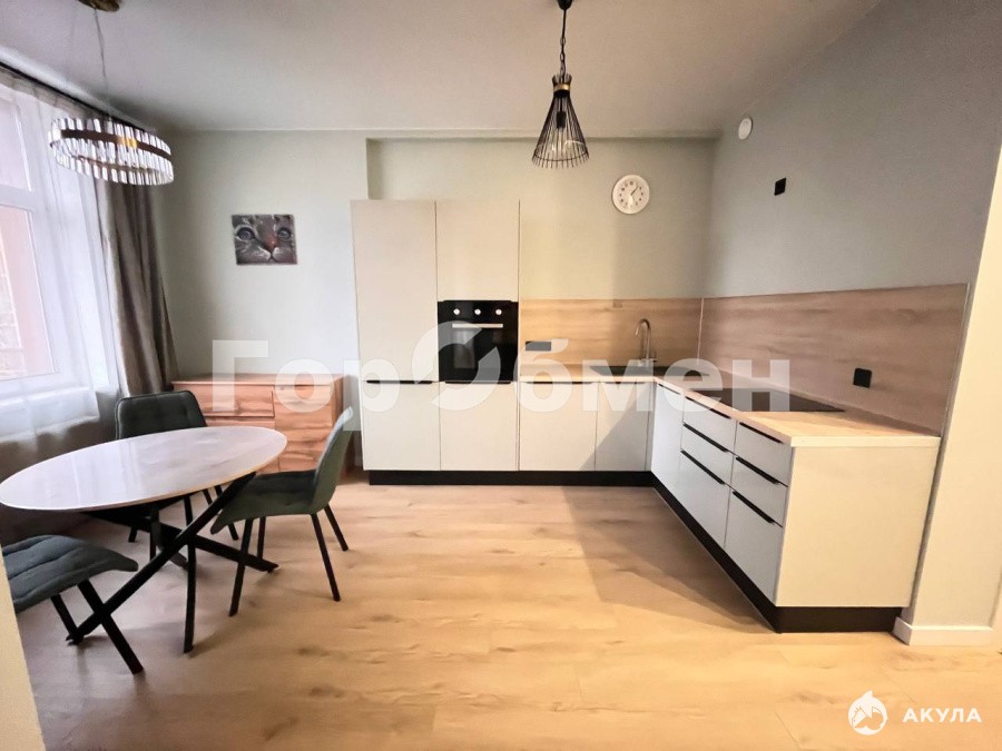 - Кухня со встроенным духовым шкафом, посудомоечной машиной, вытяжкой, варочный поверхностью и холодильником.