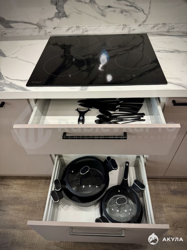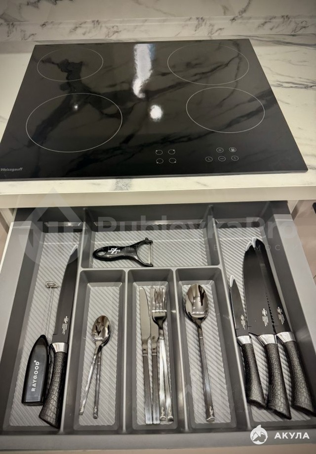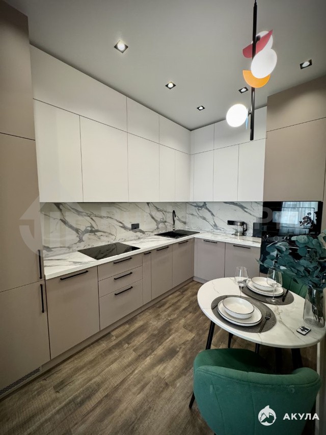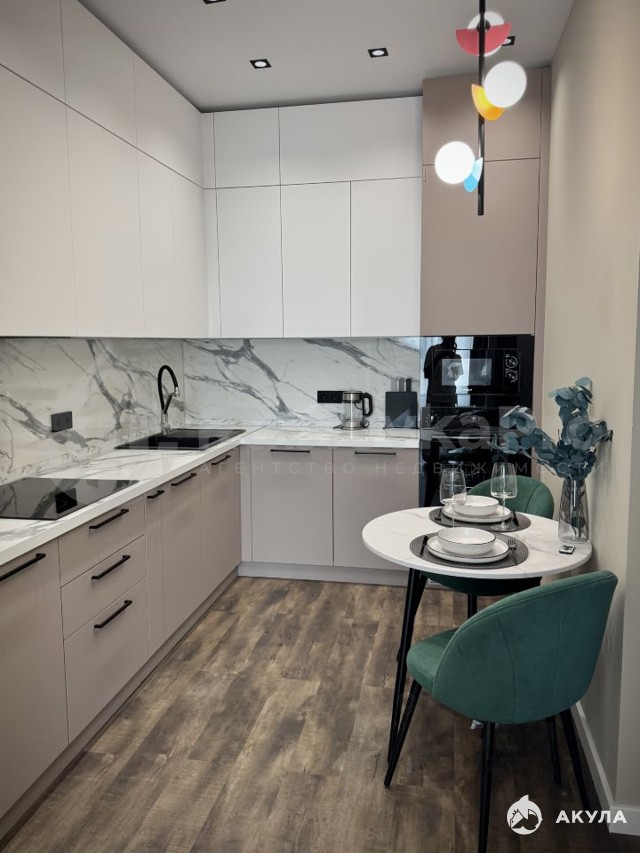 В квартире выполнен дизайнерский ремонт. Квартира полностью обставлена мебелью, есть кондиционер. Кухня оснащена всей необходимой техникой: холодильник, встроенная посудомоечная машина, СВЧ и духовой шкаф, варочная панель, вся необходимая посуда для приготовления. Стиральная машина с сушкой в ванной, бойлер, датчики затопления. В гостиной удобный диван и телевизор. Отдельная гардеробная комната.