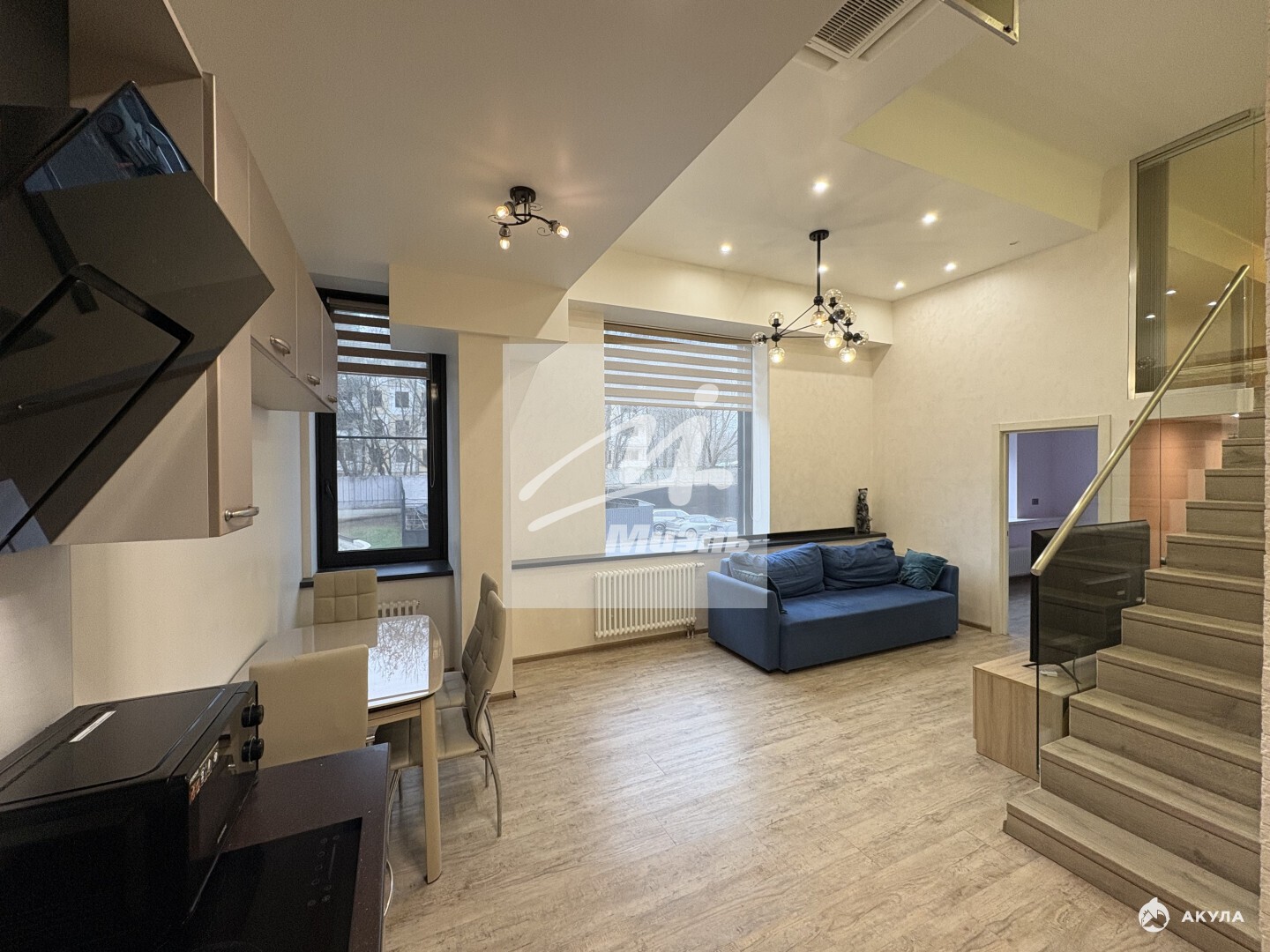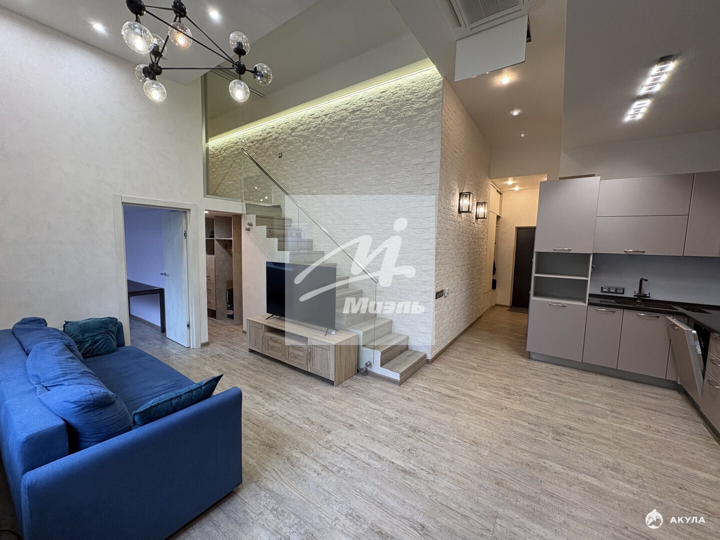 Эта стильная квартира с качественным ремонтом, оборудована всей необходимой мебелью и техникой. Высокие потолки и панорамные окна с видом во двор, наполняют помещение светом и создают ощущение простора. Планировка включает в себя кухню-гостиную которая переходит в зону отдыха, спальню на верхнем уровне, изолированную детскую комнату, вместительную гардеробную комнату, совмещенный санузел.