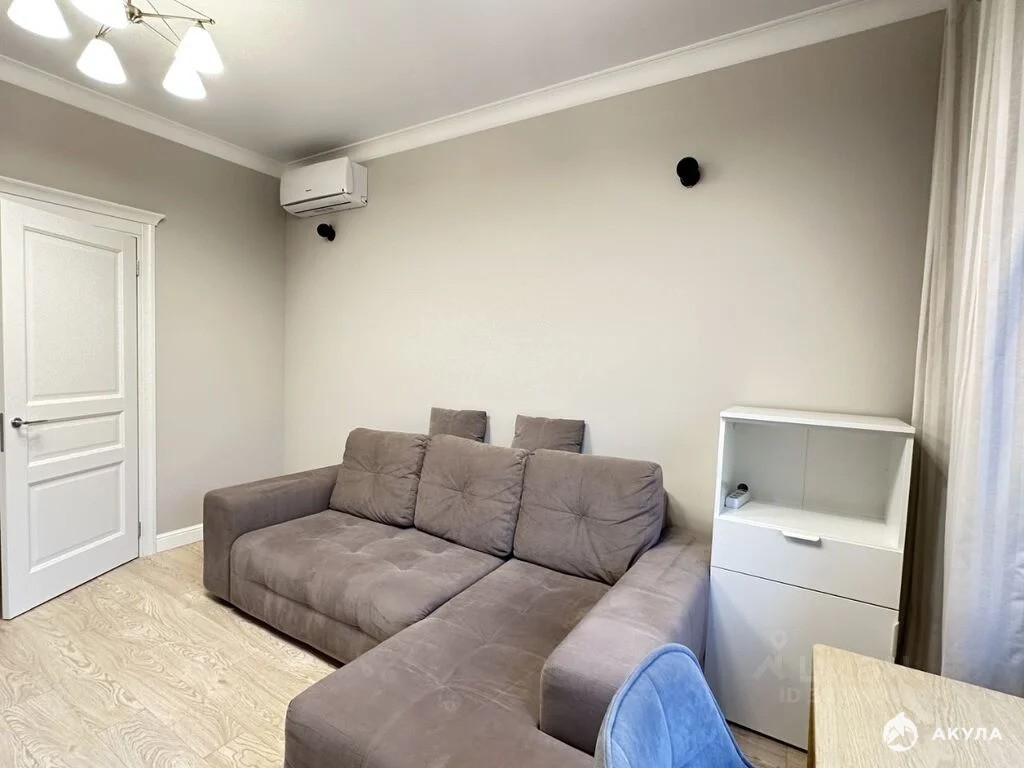 В гостиной угловой раскладной диван, рабочее место, телевизор+ домашний кинотеатр, сплит система и бризер, шкафы.