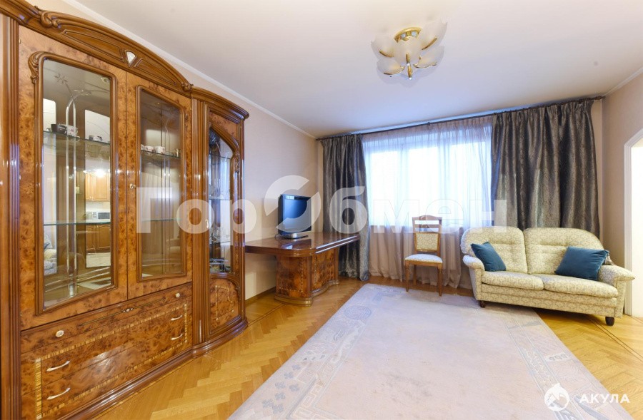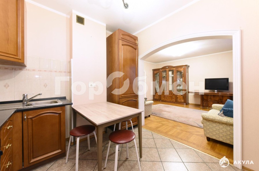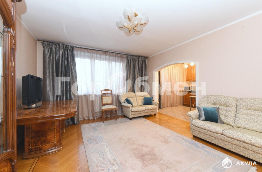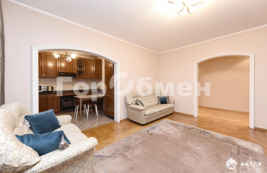 Планировка квартиры включает в себя гостиную комнату, обьединенную с кухней и две спальные комнаты. Есть застекленная лоджия, а также гардеробная комната.
