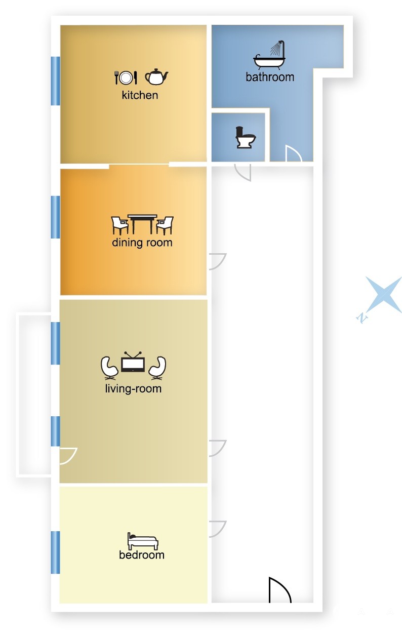 Планировка: просторная полностью оснащенная кухня-столовая с электрический камином, гостиная с балконом и спальня, 1, 5 санузла (джакузи). Парковка на территории, охранная сигнализация, видеонаблюдение.