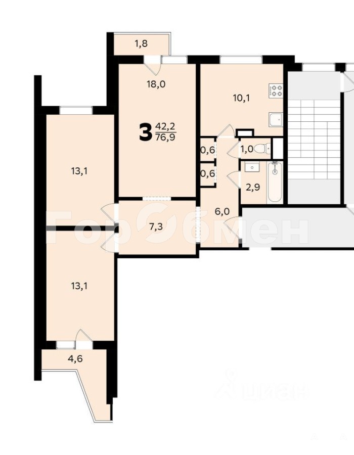 Просторные изолированные комнаты 18, 13 и 13 м2. Квартира по планировке - распашенка.