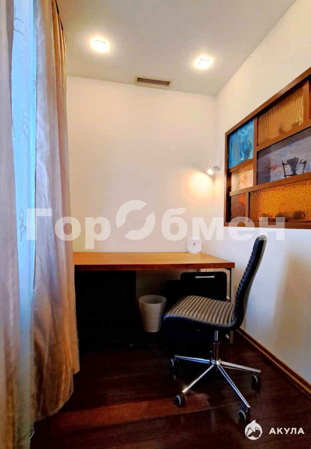 2 изолированные комнаты – спальня 18 кв.м. и детская 14 кв.м., кабинет – 6 кв.м., 2 санузла: гостевой и большой санузел с ванной и душевой кабиной, подсобное помещение со стиральной машиной и дополнительным холодильником, вместительная гардеробная, в прихожей - большой встроенный шкаф.