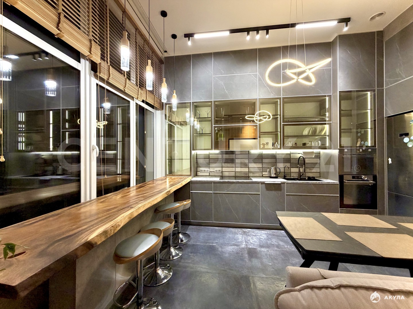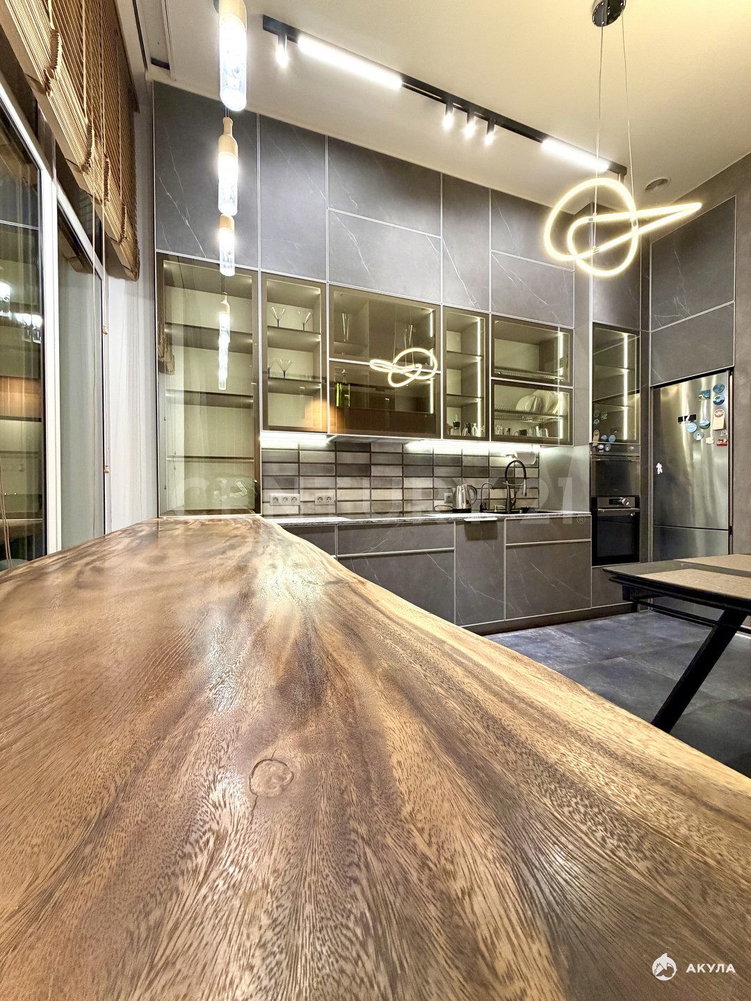 Выполнен свежий ремонт с премиальной отделкой - широкополосный натуральный паркет под лаком, плитка лимитированной серии DIESEL модного итальянского бренда, кухня с керамическими фасадами, которые не боятся ни воды, ни огня, ни царапин. Кухонная техника премиального уровня DE DITRICH и FRENKE. Все смесители бесконтактные, встроенная сантехника.