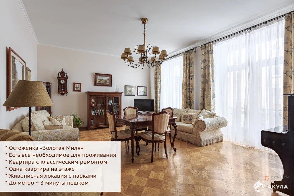 Сдаётся 4-комнатная квартира по адресу: Москва, ул. Остоженка, 5 - один из самых престижных районов столицы. Дом культурного наследия, атмосфера дореволюционной Москвы - при этом квартира полностью адаптирована под современный уровень комфорта.