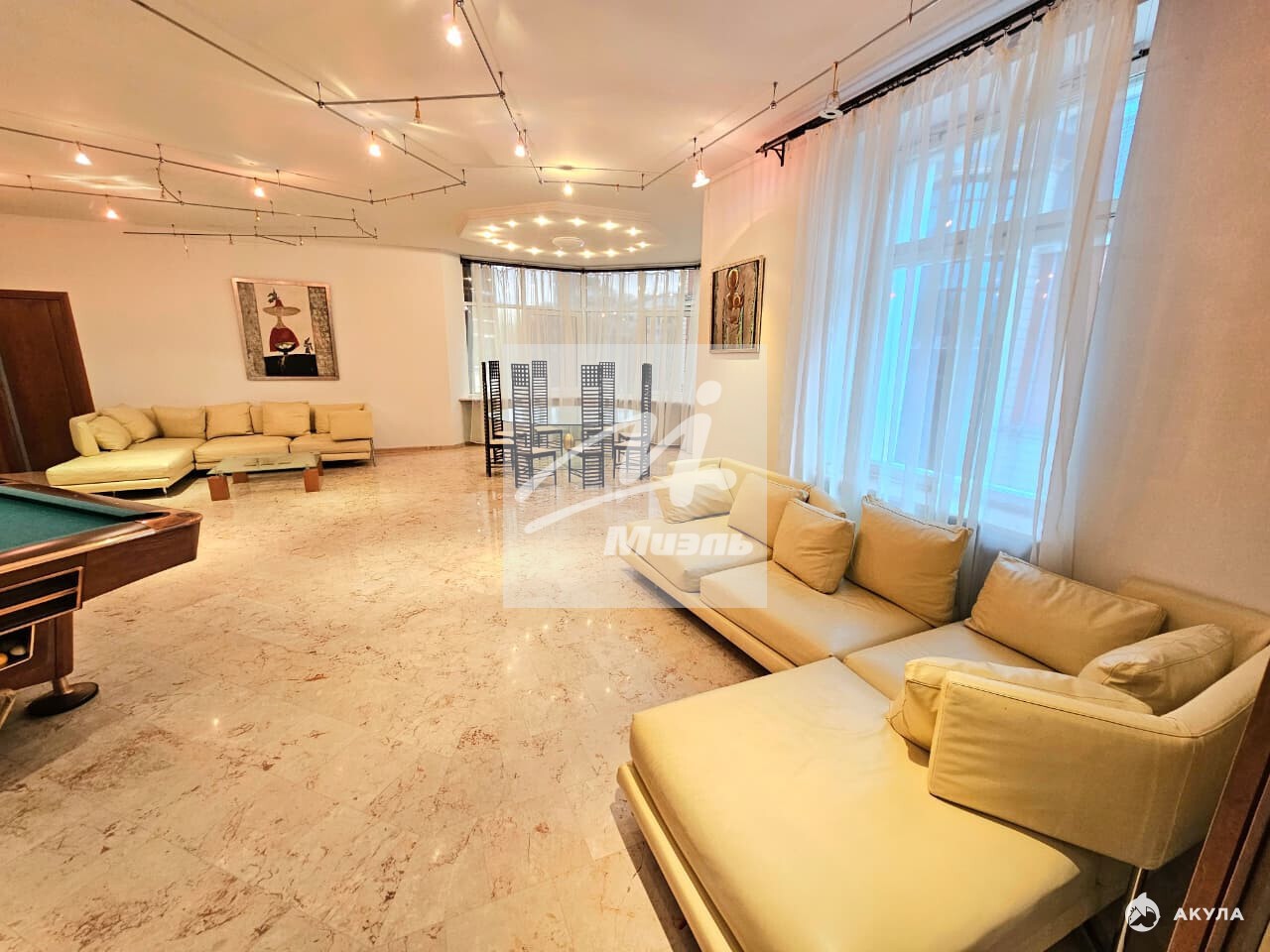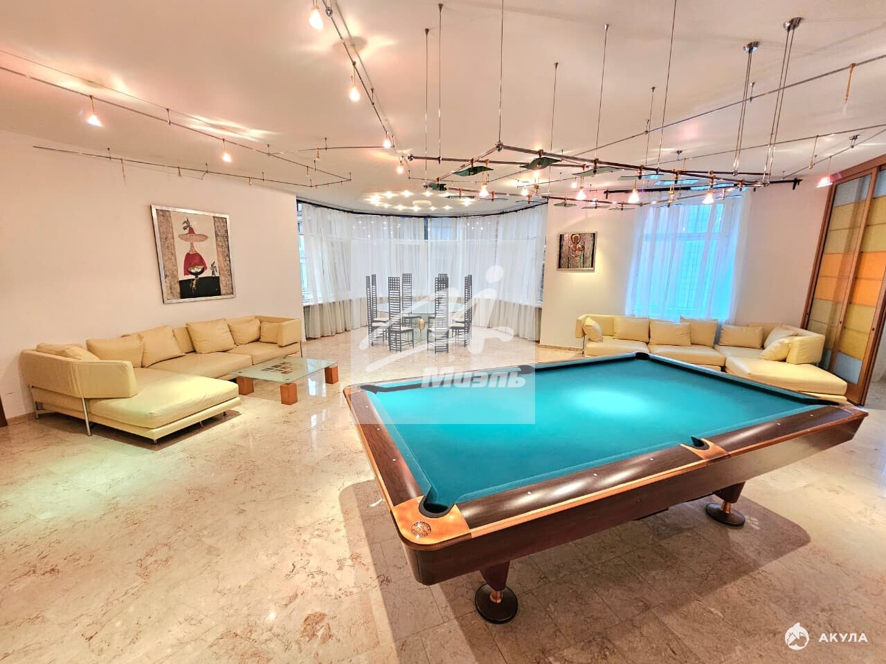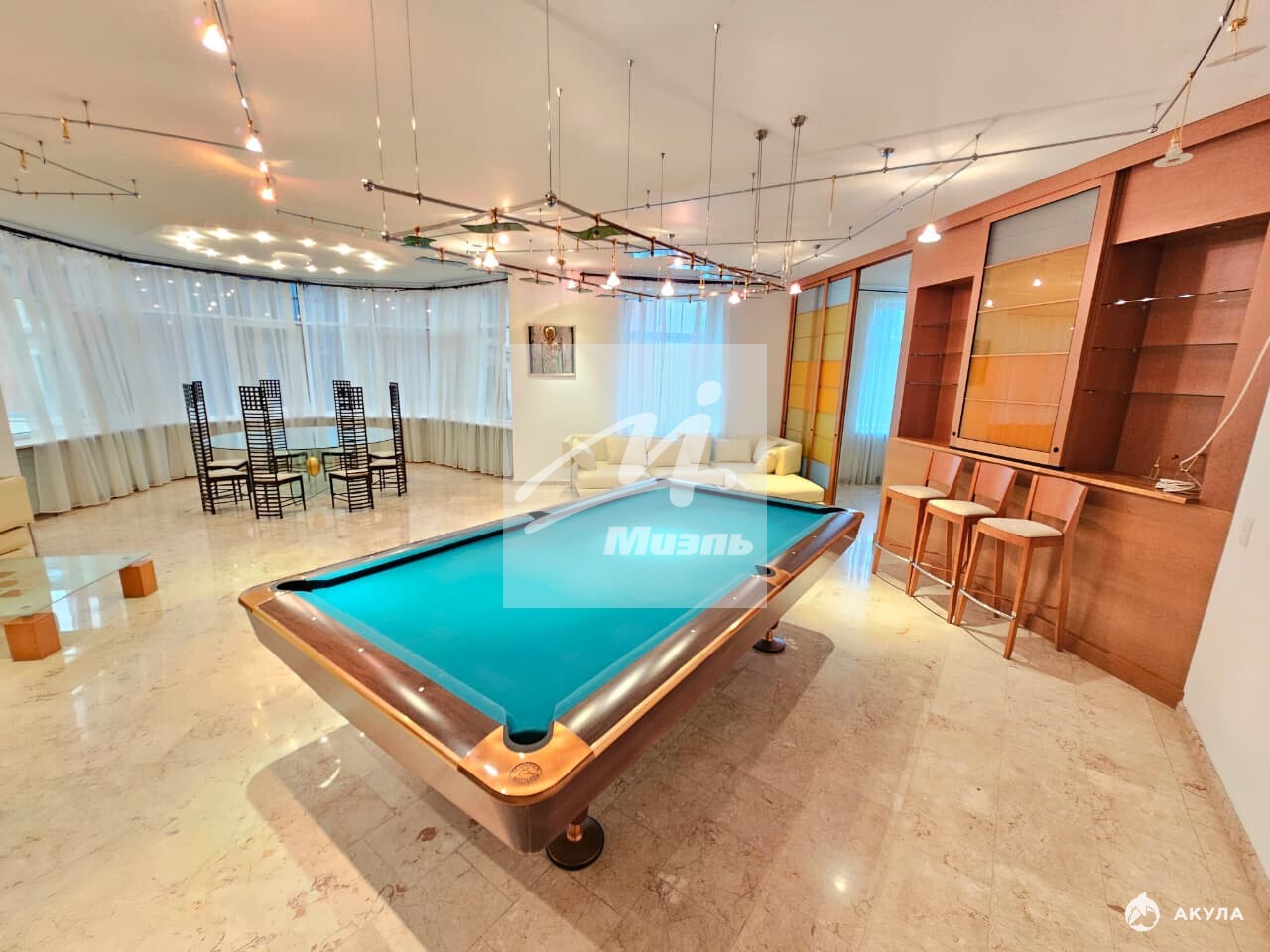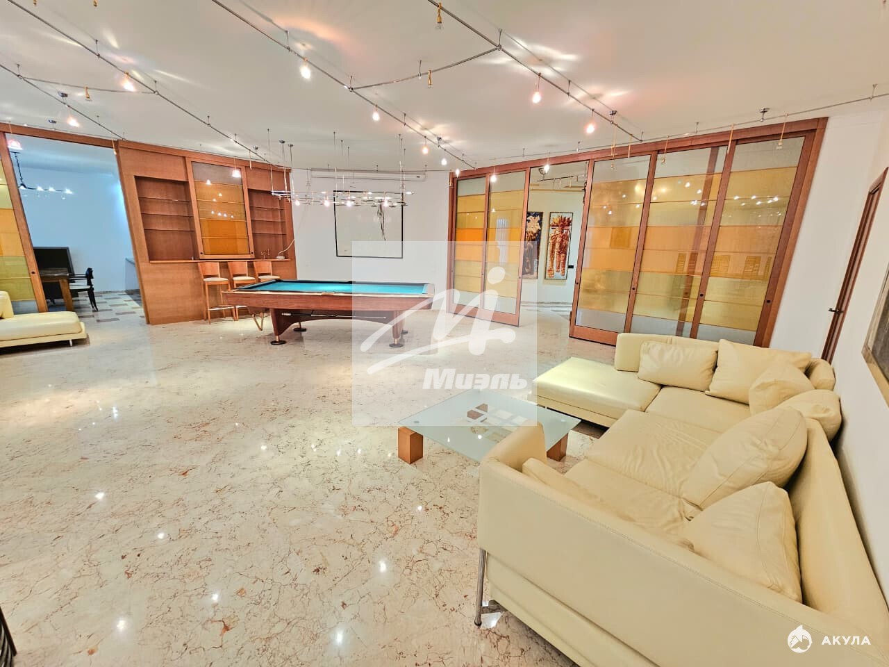 Большая кухня 32 м2 и Пять изолированных комнат - гостиная 66 м2 с бильярдным столом , 4 спальни , 3 санузла , большая гардеробная комната, терраса 15м2.