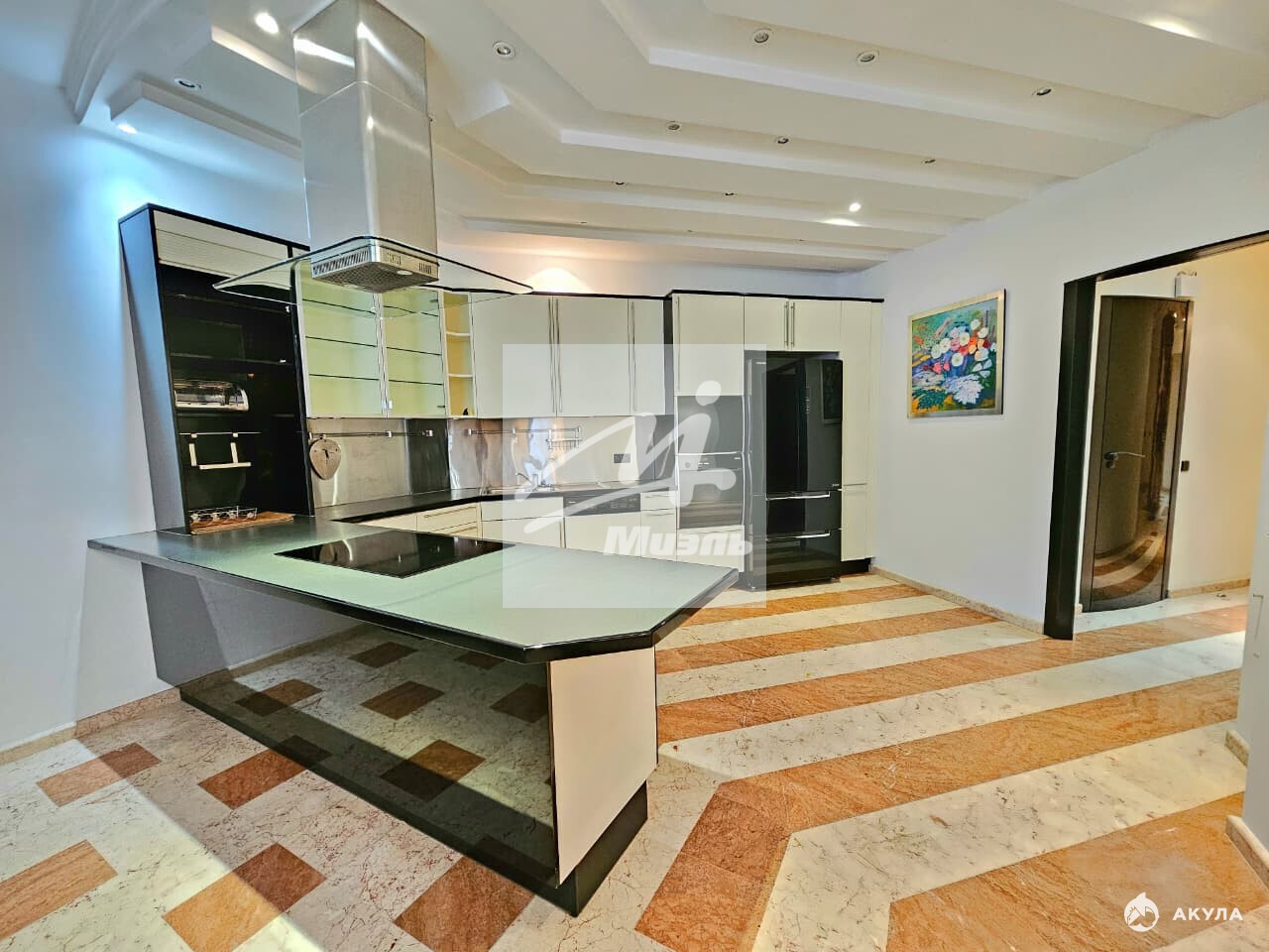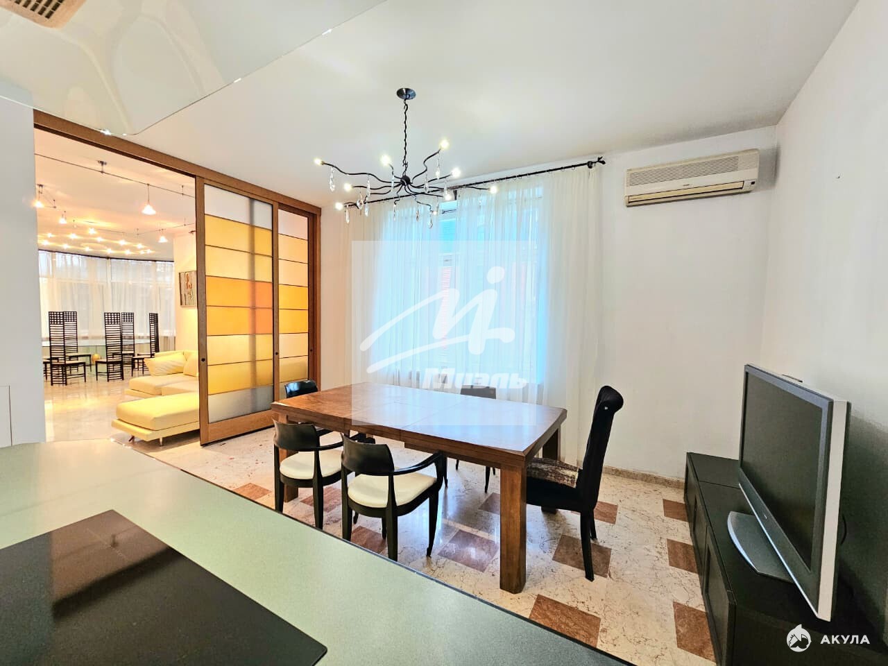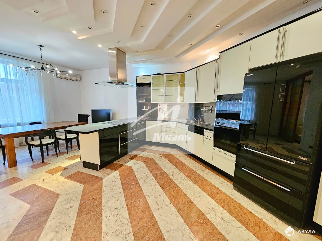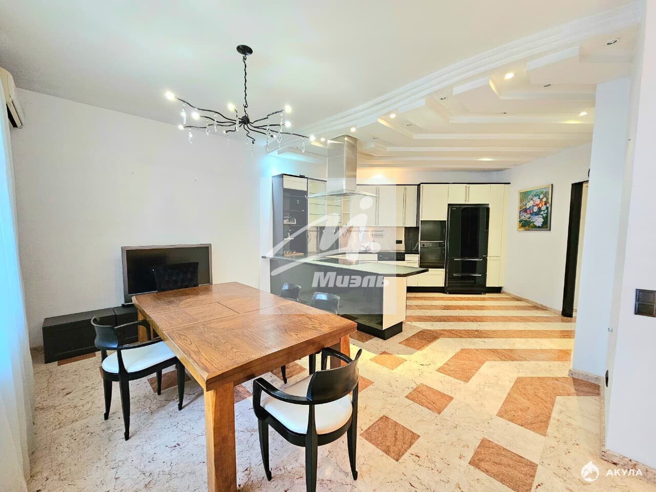 Большая кухня 32 м2 и Пять изолированных комнат - гостиная 66 м2 с бильярдным столом , 4 спальни , 3 санузла , большая гардеробная комната, терраса 15м2.