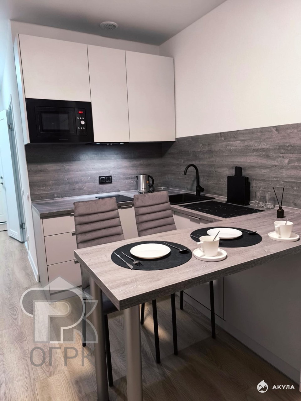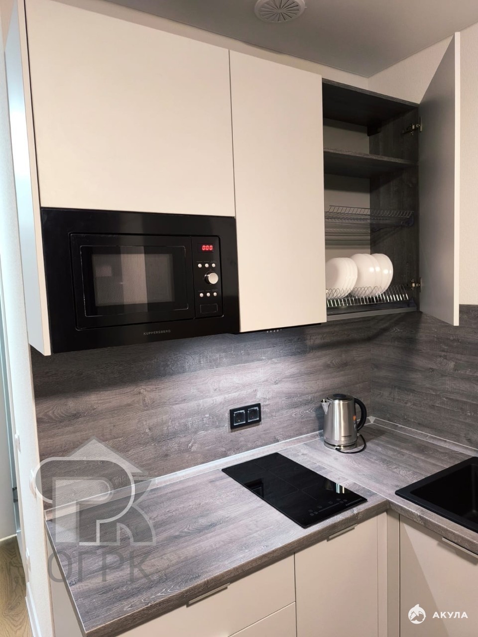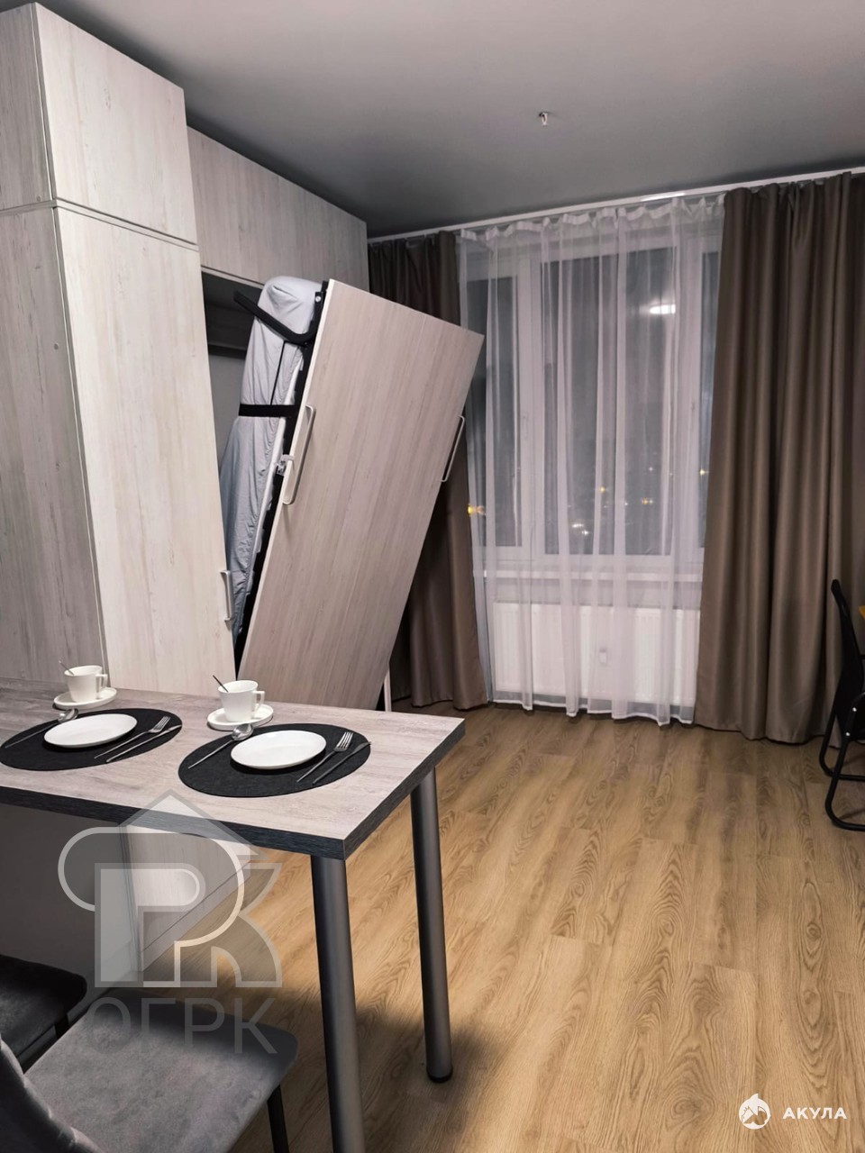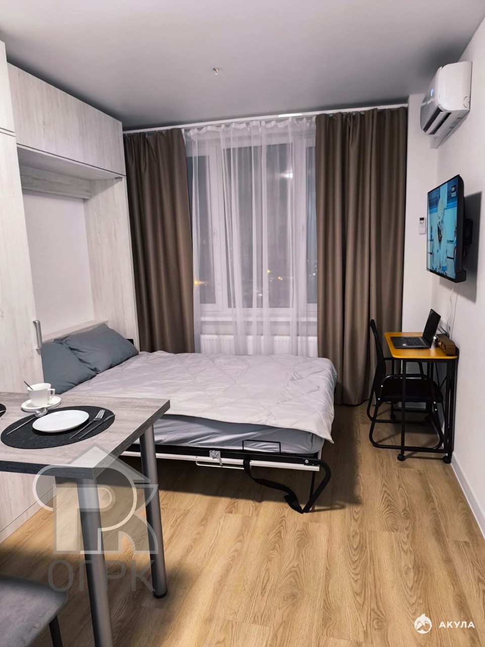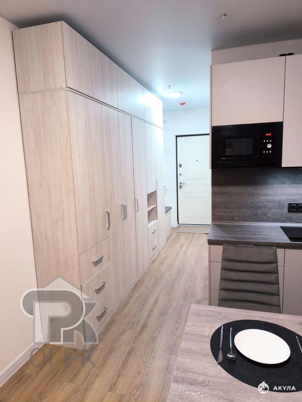 Id 387459. Студия с качественным ремонтом. Новая мебель Guter: встроенный кухонный гарнитур, шкафы для ранения, кровать трансформер. Хорошая абсолютно новая техника Hier и Kuppersberg: кондиционер, холодильник, стиральная машина, плазменный телевизор с большой диагональю, встроенная печь-гриль. Есть все необходимое для жизни влдоть до чайника и посуды. Заезжай и живи. Великолепный вид из окна. В ЖК огороженная территория, охрана, видеонаблюдение, парковка, СКУД. Отличная транспортная доступность до нескольких станций метро. Район зеленый, экологически чистый с хорошей развитой инфраструктурой.