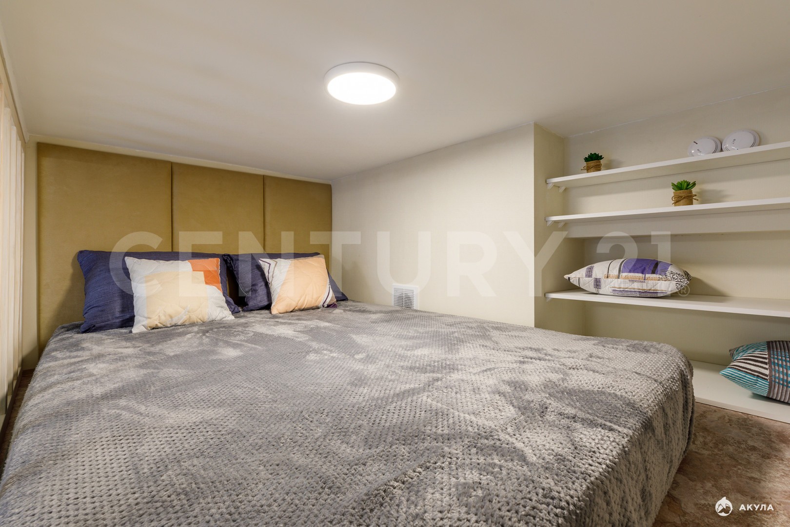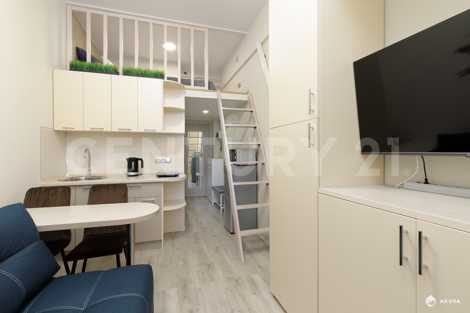 Общая площадь 19 кв. м. На первом уровне кухня совмещённая с гостиной, на втором уровне - спальня.