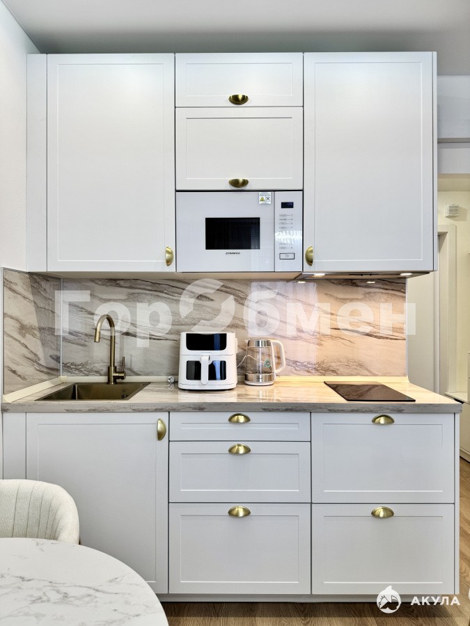 - Полный набор бытовой техники: холодильник, стиральная машина, варочная панель, микроволновка, аэрогриль, чайник.