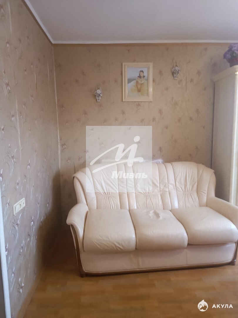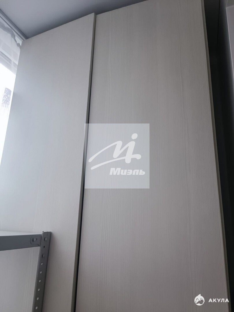 В комнате установлен вместительный шкаф и диван, создающий комфортное пространство для отдыха. Балкон застеклен, что позволяет использовать его как дополнительное место для хранения.